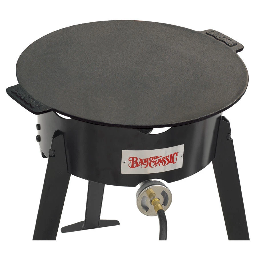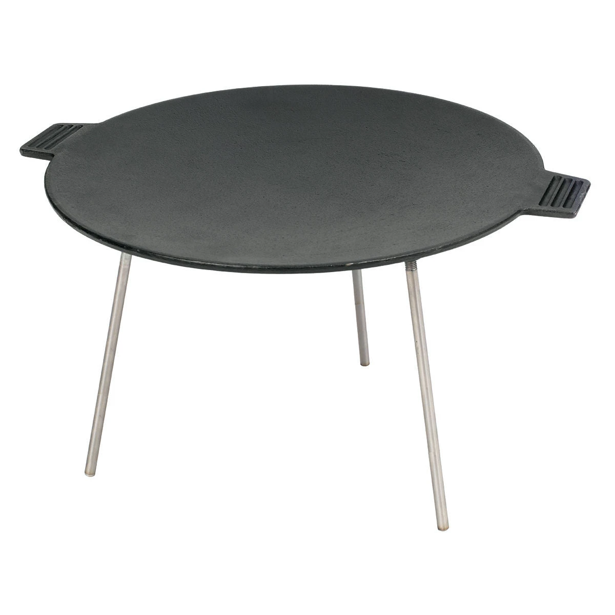 Unlike other campfire griddles, the Bayou Classic Cast Iron Campfire Griddle Discada is very versatile.  Use the Bayou Classic Cast Iron Campfire Griddle on a campfire or use it with one of our outdoor propane burners.  This cast iron campfire griddle has a rounded interior, flat bottom and detachable legs.