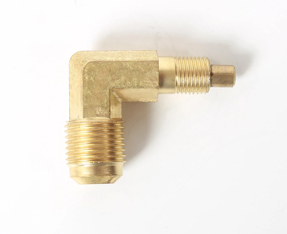 90 degree male flare burner brass fitting. 3/8 inch male fitting, with a standard MPT 1/4 inch high pressure orifice. For propane.
