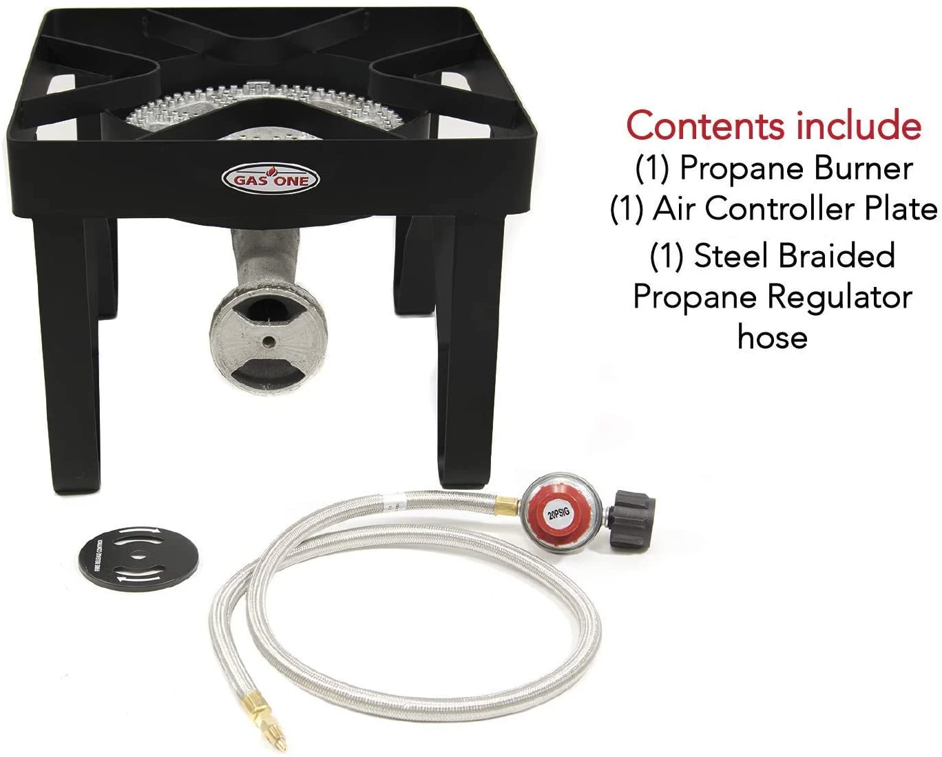 This Heavy Duty Large Pot Outdoor Propane Burner has proven to be the most effective, fastest heating propane burner on the market. The Heavy Duty Large Pot Outdoor Propane Burner can simmer a small pan by turning the Heavy Duty Large Pot Outdoor Propane Burner’s flame down to a small flame or TURN IT UP to a kick butt flame to heat a huge pot in no time! This Heavy Duty Large Pot Outdoor Propane Burner is sturdier than Bayou Classic’s Kick A Propane Burner. The Heavy Duty Large Pot Outdoor Propane Burner includes better, sturdier legs, a regulator kit and hose guard. The Heavy Duty Large Pot Outdoor Propane Burner is perfect for large batch cooking, backyards, camps, RVs, tailgating, scouting and more. It is also a perfect fit to use with jambalaya pots.