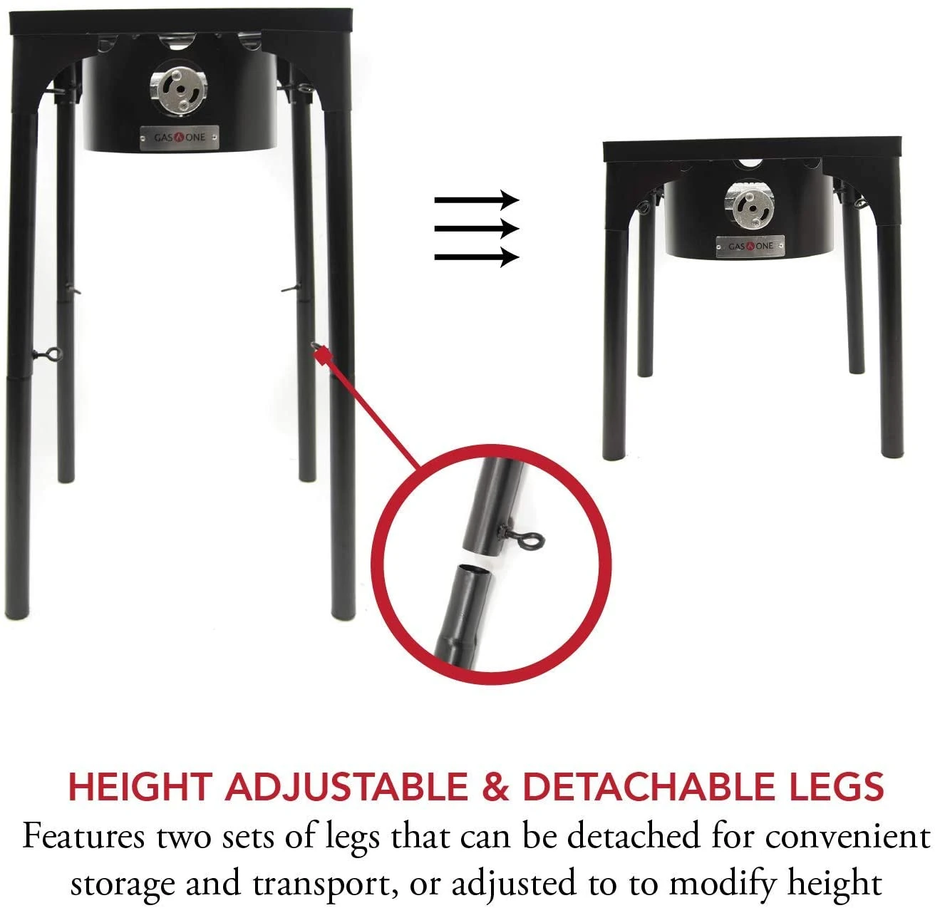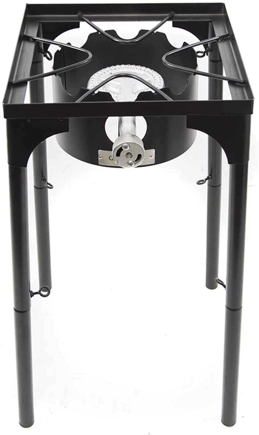 The Tall High Pressure Propane Burner comes with TWO sets of adjustable legs so you can change the height of this versatile Tall High Pressure Propane Burner. We suggest this Tall High Pressure Propane Burner if you pan on frying fish as well as using it to boil larger pots and turkey frying. This tall high pressure propane burner is perfect for your large 20 quart dutch ovens all the way down to your smallest cast iron cookware. The face of the cooking area measures 15.75 x 15.75 inches.
