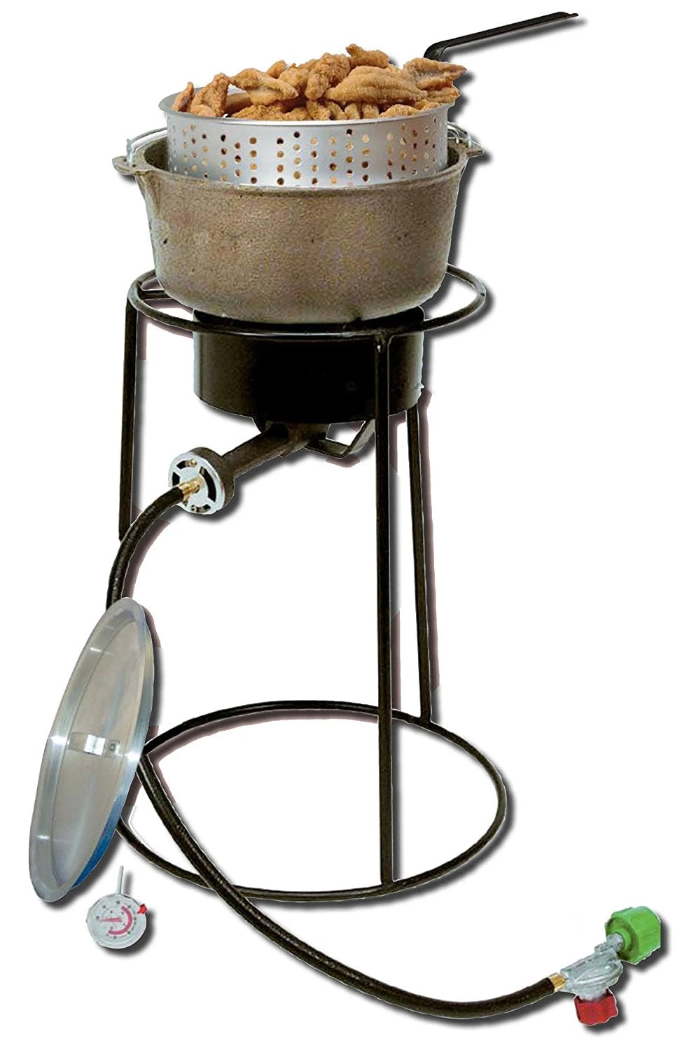 - Cast iron pot with aluminum lid and punched aluminum basket with heat resistant handle, deep fry thermometer