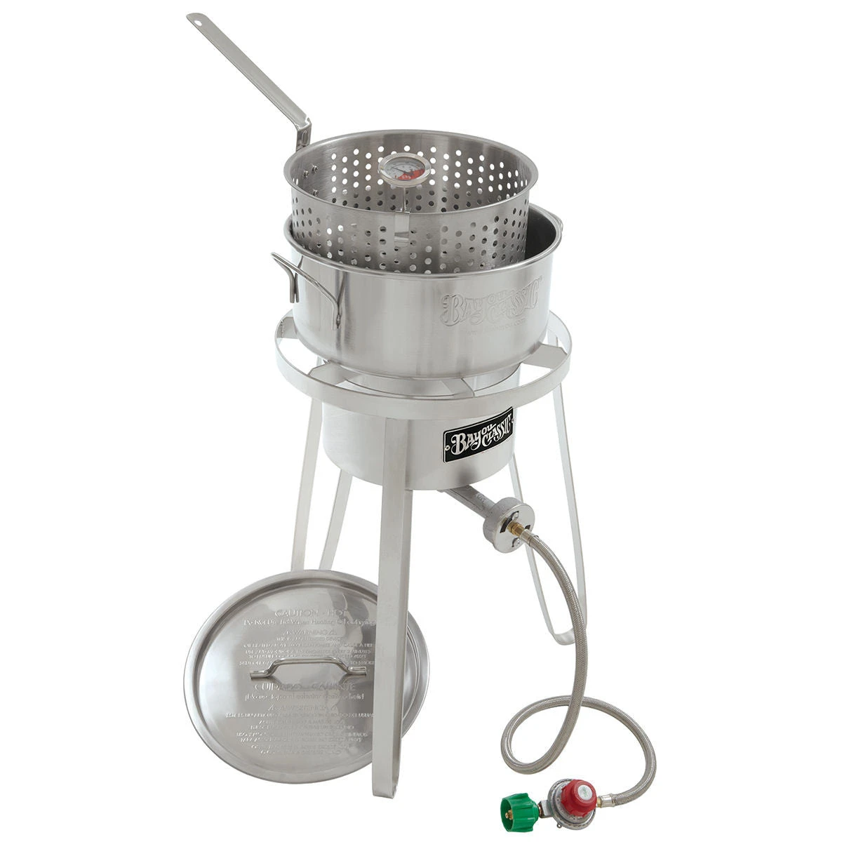 The Bayou Classic Stainless Outdoor Cooker includes a stainless steel outdoor cooker, stainless steel pot, thermometer and basket. The Bayou Classic Stainless Outdoor Cooker is the all stainless steel version of our popular B135 outdoor cooker kit. This Bayou Classic Stainless Outdoor Cooker is the perfect kit for frying fish. Because the fish fry pot is stainless steel, it will be super easy to clean! It’s the perfect size for just a few fish or a lot of fish. (You don’t have to fill up the pot to cook in it.) We also have to mention that this kit is just so dang pretty!